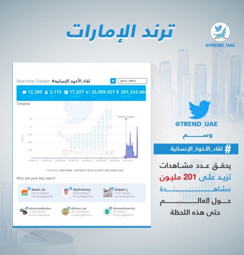حقق وسم "لقاء الأخوة الإنسانية"، حقق عدد مشاهدات تزيد على 201 مليون مشاهدة حول العالم حتى اللحظة.