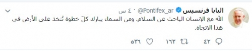 غرد البابا فرنسيس بابا الفاتيكان عبر حسابه على "تويتر" بعد لقاء الأخوة الإنسانية، الذى جمع شيخ الأزهر، الإمام أحمد الطيب، ببابا الفاتيكان، فى دولة الإمارات العربية المتحدة، قائلا: " الله مع الإنسان الباحث عن السلام. ومن السماء يبارك كلّ خطوة تُتخذ على الأرض في هذا الاتجاه".