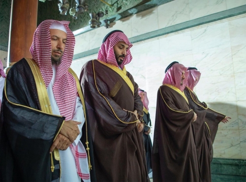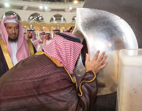 وظهر ولي العهد السعودي في مقاطع مصورة وهو يقف أمام الكعبة المشرفة ويقوم بتقبيلها خلال زيارته للحرم المكي.