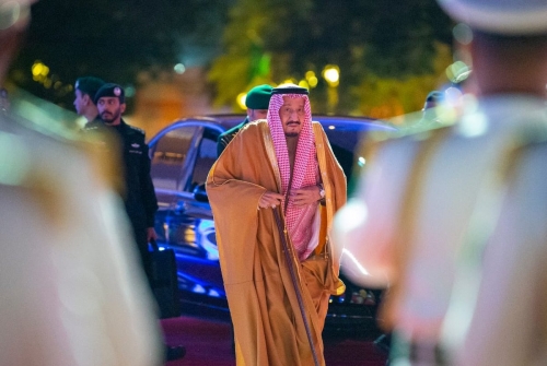 تداول نشطاء على مواقع التواصل الاجتماعي "تويتر"، اليوم الخميس، صور ومقاطع مصورة من دخول ملك السعودية، الملك سلمان بن عبد العزيز، إلى مكتبه بقصر الحكم في الرياض.