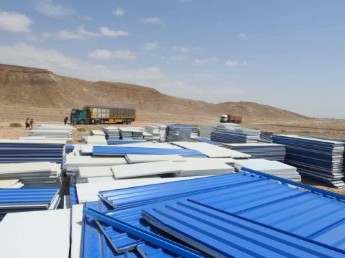 شهدت مديرية المسيلة بمحافظة المهرة وصول الدفعة الأخيرة من المنازل الحديدية الجاهزة والمصنعة من الحديد المقوى.