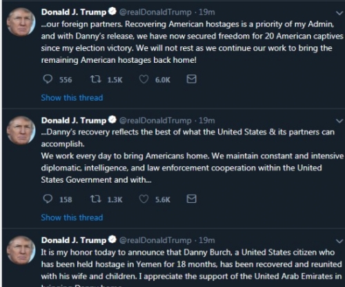وغرد "ترامب" عدة تغريدات على " تويتر" قائلا: "نعمل كل يوم لإعادة الأمريكيين إلى بلادهم و نحافظ على التعاون الدائم والمكثف بين الجهات الدبلوماسية والاستخباراتية وإنفاذ القانون داخل حكومة الولايات المتحدة ومع شركاءنا الأجانب".