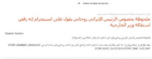 رويترز تحذف خبر قبول روحاني استقالة ظريف وتعلن: خبر خاطئ