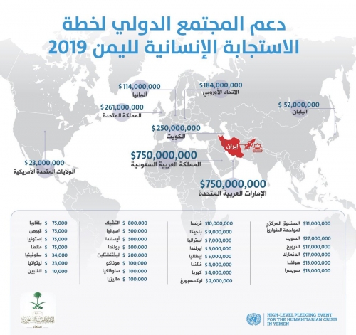 وأرفق تغريدته بانفوجرافيك، يُظهرّ تصدر السعودية والإمارات للدول المانحة لعام 2019 بتمويل قدره 750 مليون دولار لكلٍ منهما، وبقيمة إجمالية 1.5 مليار دولار، فيما حلت المملكة المتحدة في المركز الثالث بحجم تمويل قدر بـ261 مليون دولار، ثم الكويت بـ250 مليون دولار، ومن خلفهم الاتحاد الأوروبي بـ 184 مليون دولار، وألمانيا 114 مليون دولار، ثم تأتي اليابان والولايات المتحدة بحجم تمويل 52 مليون دولار للأولى و23 مليون دولار للثانية.