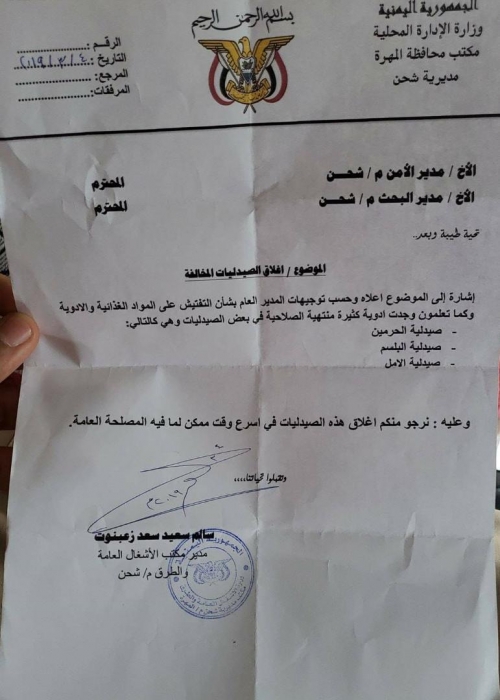 يأتي ذلك على خلفية حملة التفتيش المشتركة التي انطلقت قبل أيام برعاية الشيخ راجح سعيد باكريت محافظ المهرة ،و نفذها مكتبي الصحة والأشغال العامة بالمديرية بالتنسيق مع الأجهزة الأمنية بناء على توجيهات مدير عام شحن الشيخ محمد بن محمد زعبنوت .