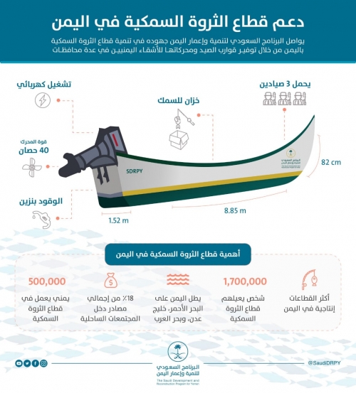 وتابع: طلتمكين هؤلاء الصيادين من رفع كفاءتهم، يدرس البرنامج السعودي لتنمية وإعمار اليمن تزويدهم بقوارب صيد جديدة مع محركاتها، ضمن أهداف البرنامج في دعم وتنمية قطاع الثروة السمكية في اليمن".