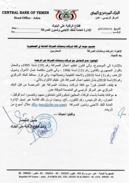وتضمن القرار الخاص بتنظيم أعمال الصرافة،إيقاف التعامل الفوري مع كافة منشآت وشركات الصرافة الغير مرخصة من قبل البنك المركزي عبر المركز الرئيسي في العاصمة عدن.