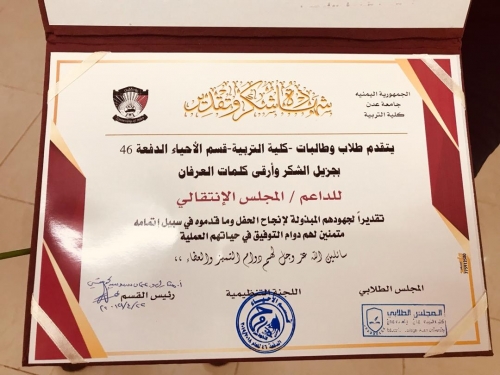 وأشاد الطلاب، أثناء تسليمهم شهادة الشكر لرئيس الدائرة التنظيمية بالأمانة العامة لهيئة الرئاسة، منصور زيد حيدرة، بالمواقف الداعمة للمجلس لأنشطة طلاب الجامعة ومشاريعهم العلمية ومبادراتهم الإيجابية.