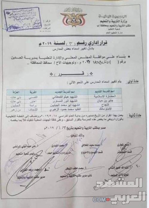 أصدرت مليشيا الحوثي في مديرية العدين بمحافظة إب قرارا بتغيير أسماء المدارس في المديرية بأسماء القتلى من قياداتها .
