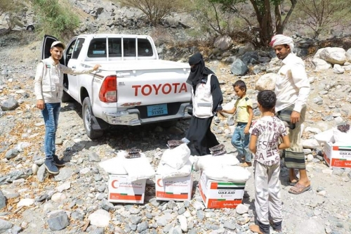 الهلال الأحمر الإماراتي يوزع 100 طن مواد غذائية على أكثر من 1200 من أسر الشهداء بلحج