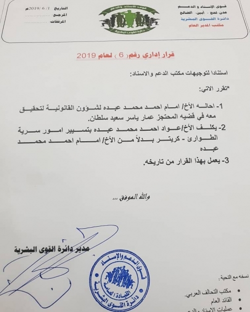 وأكدت قيادة الدعم والإسناد أنها لن تسمح لأي قيادي من تجاوز الصلاحيات الممنوحة له ،وأنها ملتزمة في الحفاظ على أمن المواطن وسلامته.
