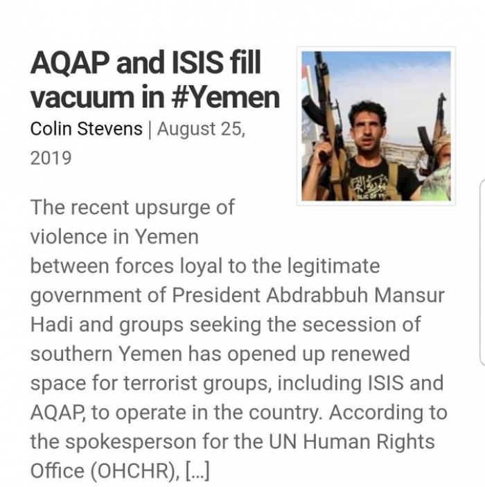 وقال في تغريدة عبر "تويتر" رصدها "المشهد العربي": "لم يعد هناك من شك أن القاعدة و داعش وجدت فرصتها لتملئ الفراغ الذي سيحدث بسبب غياب النخبة الشبوانية بعد أن سمحت القوات القادمة من مأرب لعناصرها بالتسلل ضمن عداد قواتها.