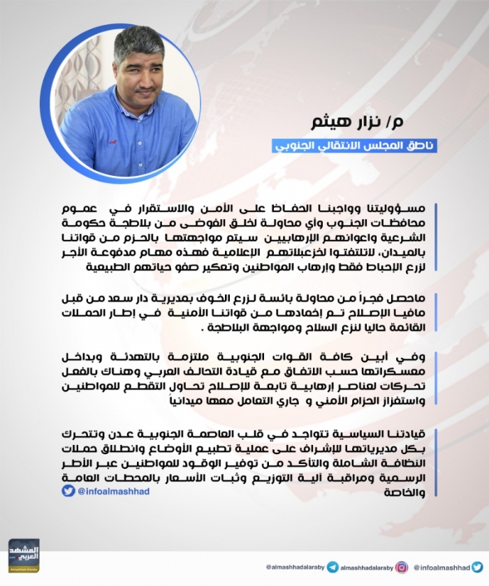 أصدر نزار هيثم المتحدث الرسمي باسم المجلس الانتقالي الجنوبي بيان هاما، لتوضيح حقيقة ما حدث في العاصمة عدن فجر اليوم الثلاثاء من قبل مليشيا الإخوان الإرهابية.