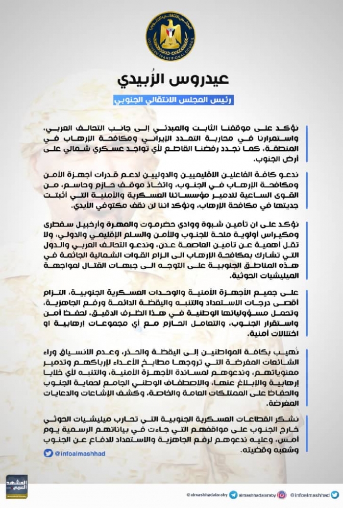 وأكد الزًبيدي في كلمة له موجه إلى الشعب الجنوبي للتعليق على الأحداث على الساحة الجنوبية، على الموقف الثابت والداعم للمجلس الانتقالي إلى جانب التحالف العربي، واستمراره في محاربة التمدد الإيراني ومكافحة الإرهاب في المنطقة، بالإضافة إلى الرفض القاطع لأي تواجد عسكري شمالي على أرض الجنوب.