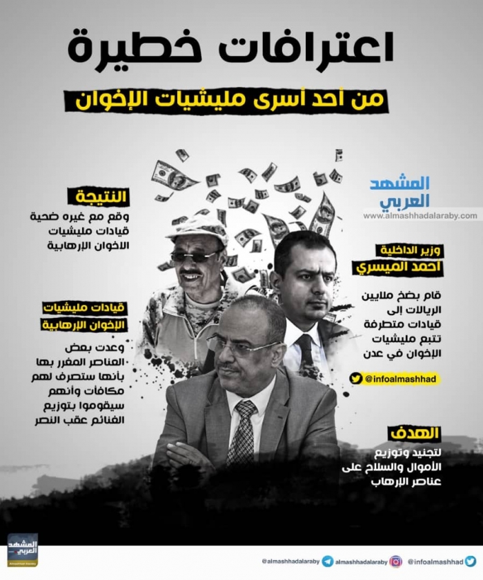 "الانفوجراف" التالي يلقي الضوء على أهم الاعترافات التي قالها أحد أسرى مليشيات الإخوان، والتي من أهمها قيام وزير الداخلية الهارب أحمد المسيري بضخ ملايين الريالات إلى قيادات متطرفة تتبع المليشيات في عدن.