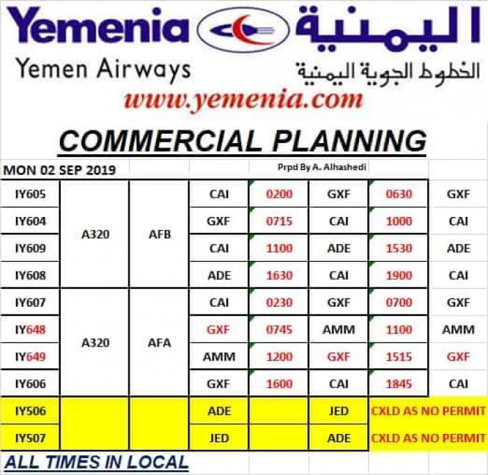 ينشر "المشهد العربي" مواعيد إقلاع رحلات طيران اليمنية غداً الإثنين الموافق 2 سبتمبر 2019.