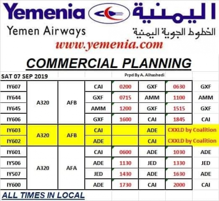 ينشر "المشهد العربي" مواعيد إقلاع رحلات طيران اليمنية غداً السبت الموافق 7 سبتمبر 2019.