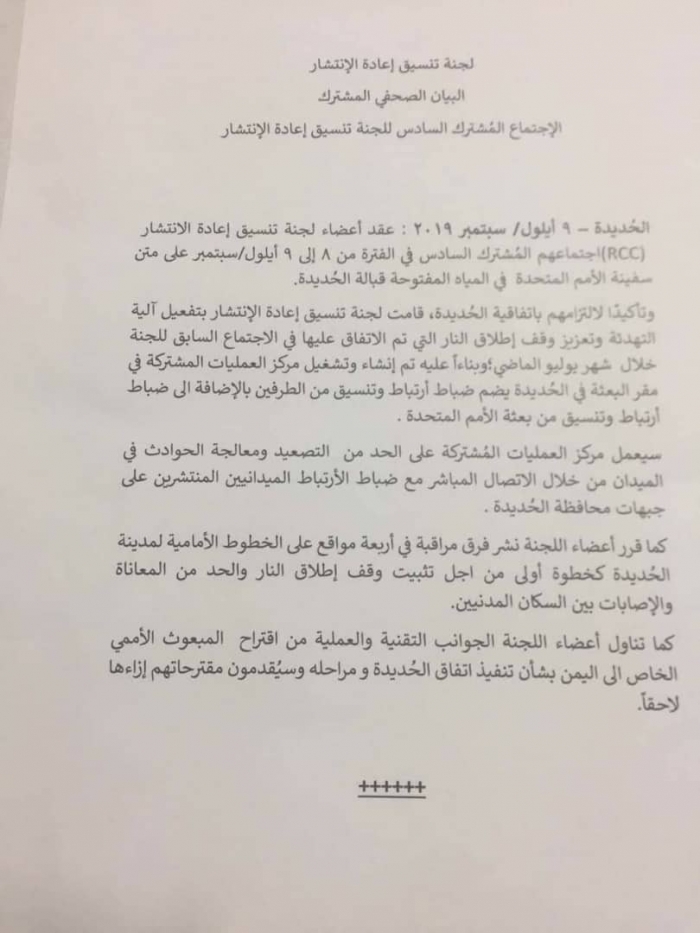 تفاصيل بيان الاجتماع المشترك السادس للجنة تنسيق إعادة الانتشار بالحديدة
