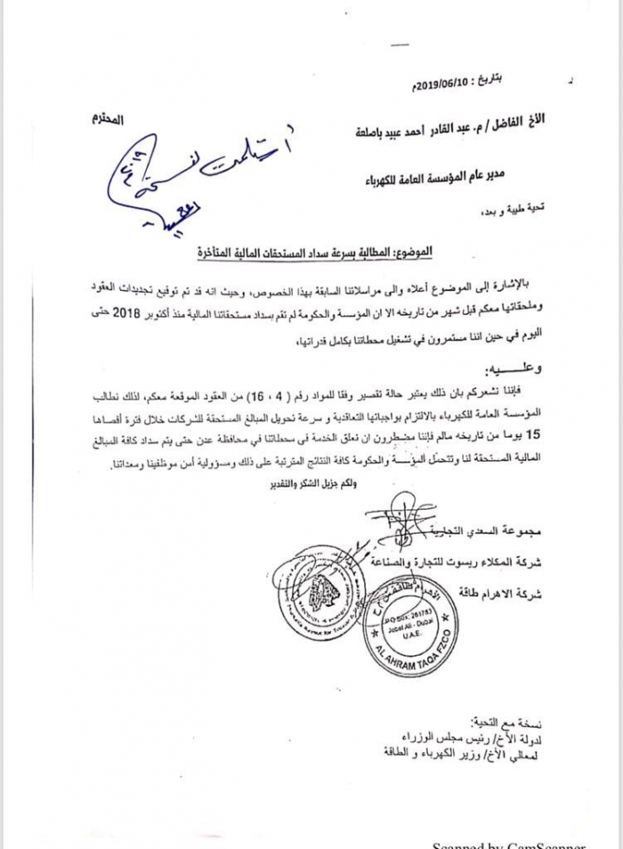 ونشر مسهور، عبر حسابه على موقع التواصل الاجتماعي تويتر، تابعها المشهد العربي "وثيقة تؤكد عدم سداد الحكومة اليمنية للمستحقات المالية للشركات المزودة للمازوت من أكتوبر 2018م حتى يونيو 2019م".