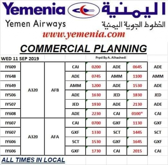 ينشر "المشهد العربي" مواعيد إقلاع رحلات طيران اليمنية غداً الأربعاء الموافق 11 سبتمبر 2019.