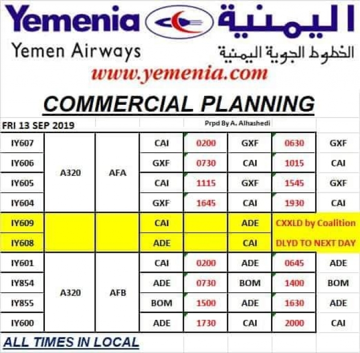 ينشر "المشهد العربي" مواعيد إقلاع رحلات طيران اليمنية غداً الجمعة الموافق 13 سبتمبر 2019.
