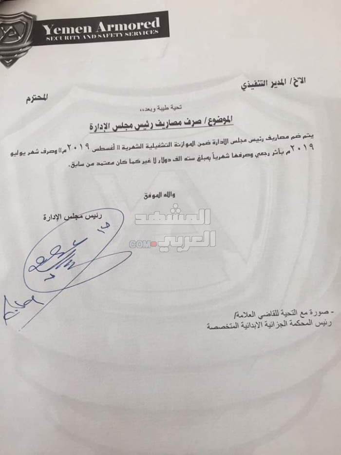 وأظهرت الوثيقة التي وجهت من القيادي الحوثي عبدالله مسفر الشاعر المعين من المليشيا حارسا قضائيا ورئيس لمجلس إدارة شركة " يمن أرمورد "، إلى المدير التنفيذي للشركة مطالبته بصرف مصاريفه بصفته الجديدة " رئيس مجلس الإدارة " بمبلغ 6 آلاف دولار شهريا ، وصرف المبالغ الشهرية بأثر رجعي .