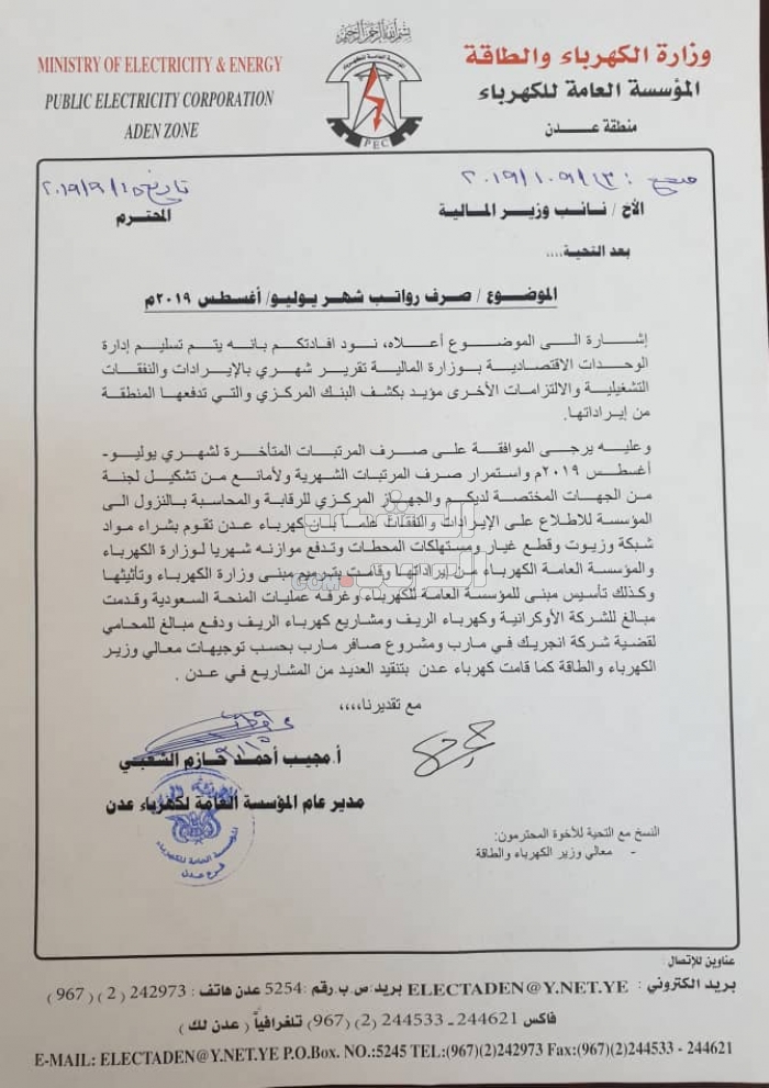 وكانت وزارة المالية قد امتنعت عن دفع مرتبات موظفي كهرباء عدن بحجة عدم توريد المؤسسة العامة للكهرباء في عدن لإيراداتها، بالرغم من عمليات الصرف الكبيرة التي تقوم بها كهرباء عدن لصرفيات ولمشاريع مختلفة في عدة محافظات وذلك بحسب توجيهات مسؤولي الشرعية.