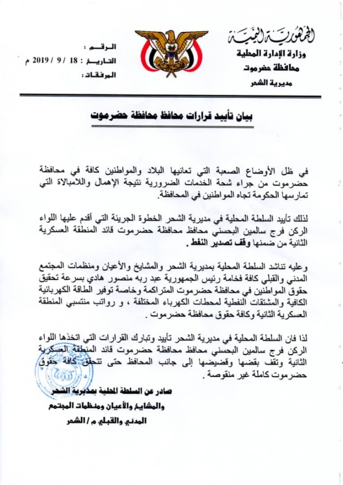 وقال بيان صادر عن السلطة المحلية بالشحر، إنها تؤيد الخطوة الجريئة التي أقدم عليها اللواء الركن فرج سالمين البحسني والتي تضمنت وقف تصدير النفط.