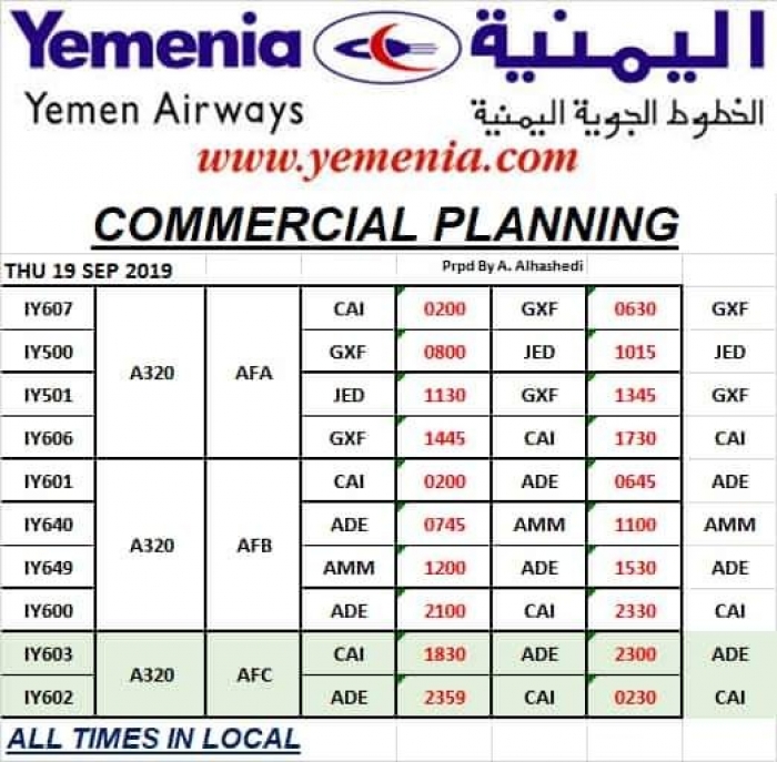 مواعيد رحلات طيران اليمنية غداً الخميس 19 سبتمبر 2019