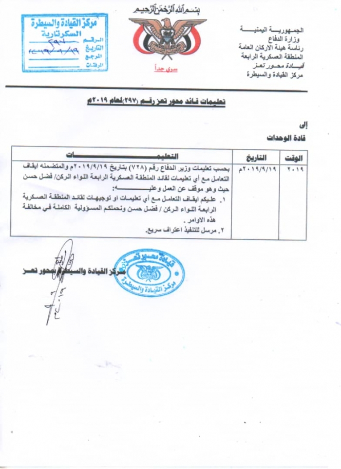 فيما أظهرت وثيقة أخرى، تجاوب محور تعز مع تلك الأوامر الصادرة من وزارة الدفاع بحكومة الشرعية وتأكيدها على عدم تعاملها مع قيادة المنطقة العسكرية الرابعة .