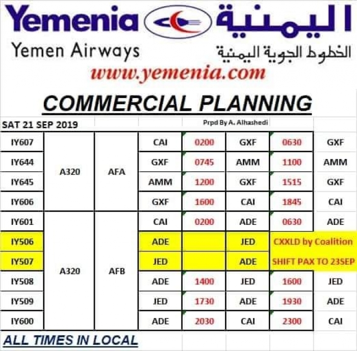 ينشر "المشهد العربي" مواعيد إقلاع رحلات طيران اليمنية غداً السبت الموافق 21 سبتمبر 2019.