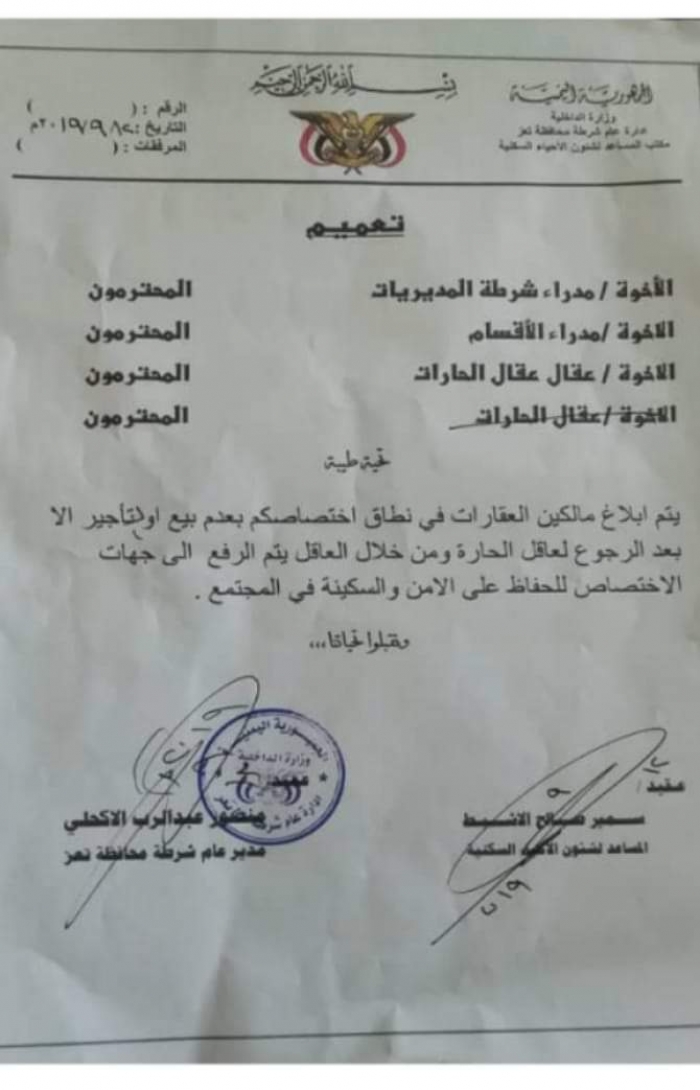 وكشفت مذكرة رسمية بتاريخ 2019/9/12م حصل "المشهد العربي" على نسخة منها توجيها من مدير شرطة تعز العميد منصور الأكحلي إلى مدراء شرطة المديريات والأقسام وعقال الحارات، يقضي بمنع مالكي العقارات في نطاق اختصاصهم من بيع أو تأجير أملاكهم إلا بعد الرجوع لعاقل الحارة، ومن خلال العاقل يتم الرفع لجهة الاختصاص للحفاظ على الأمن والسكينة العامة حسب وصف المذكرة.