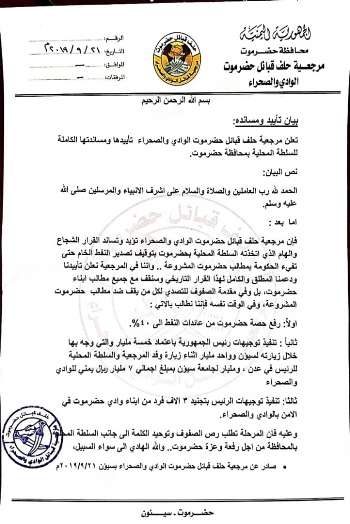 وشدد حلف فبائل حضرموت على ضرورة المشاركة الفاعلة لإبلاغ حكومة الشرعية، والعالم أنهم متمسكون بمطالبكم المستحقة، وعلى استعداد للتصعيد أكثر وأكثر، إن لم تستجب الحكومة لهذه المطالب.