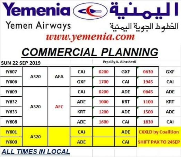 ينشر "المشهد العربي" مواعيد إقلاع رحلات طيران اليمنية غداً الأحد الموافق 22 سبتمبر 2019.