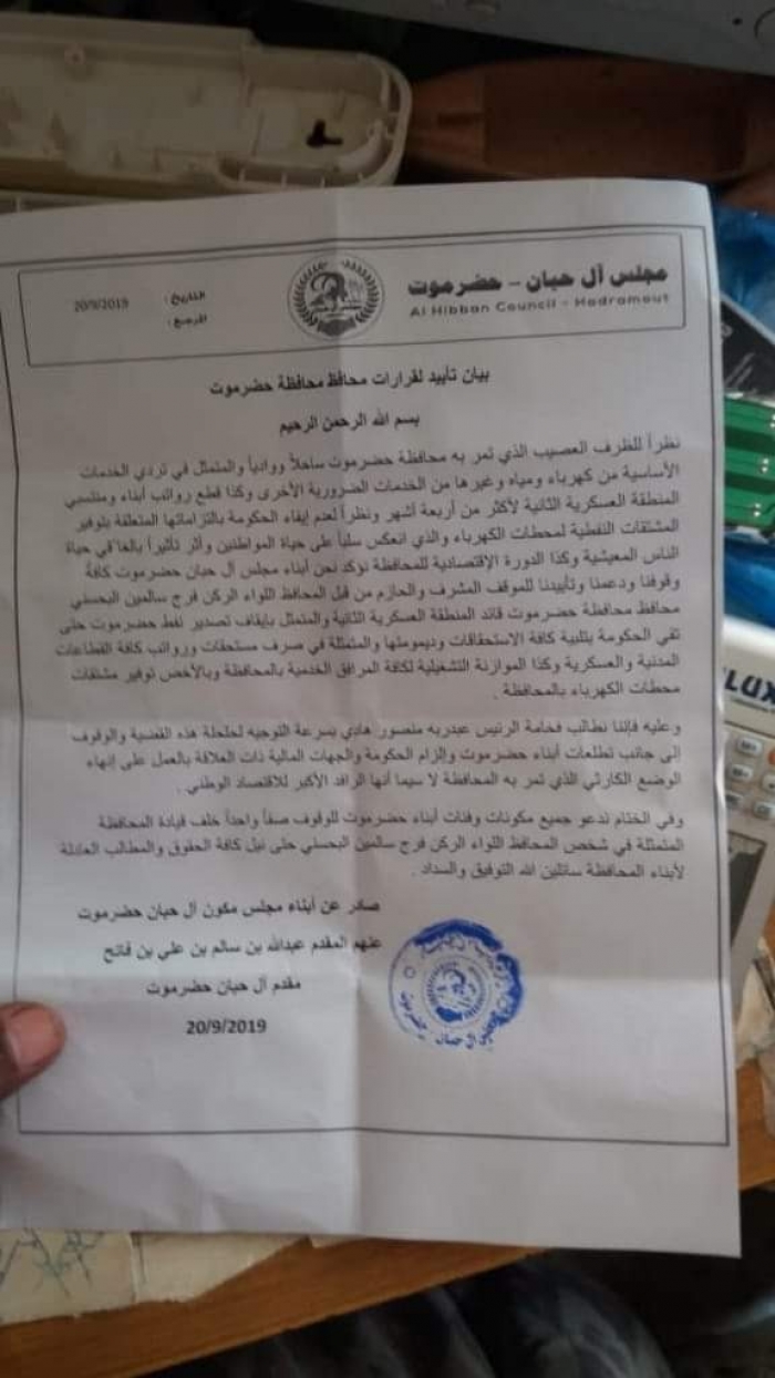 أعلن أبناء "مجلس آل حبان" بمحافظة حضرموت دعمهم الكامل لقرار محافظ حضرموت قائد المنطقة العسكرية الثانية فرج سالمين البحسني والمتمثل بإيقاف تصدير نفط حضرموت .
