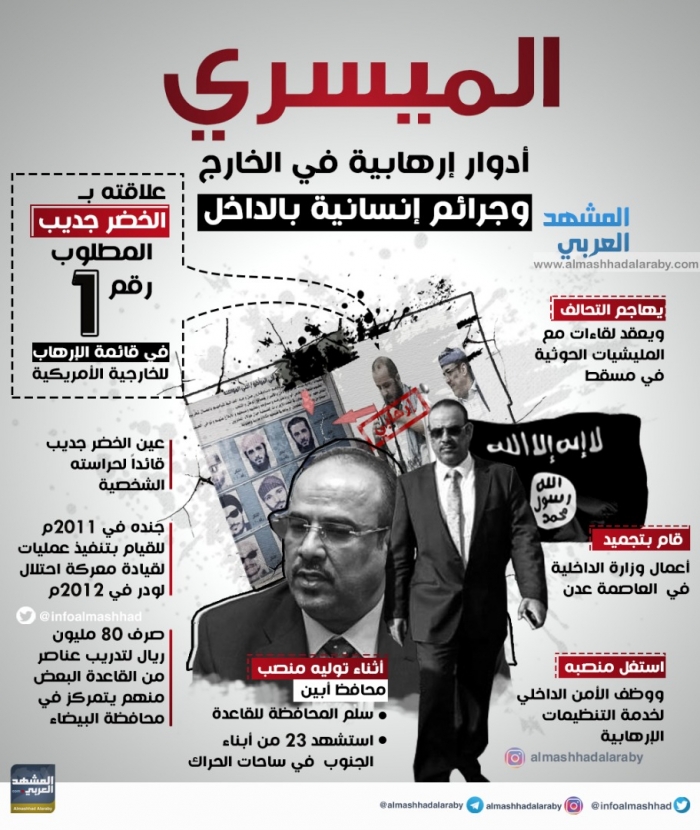 يسلط "المشهد العربي" الضوء على الدور الإرهابي لـ أحمد الميسري وزير الداخلية فيما تسمى حكومة الشرعية.