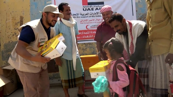 هذا و ينفذ الهلال الأحمر الإماراتي حملة توزيع الحقائب المدرسية في مختلف مدارس مديريات المحافظة في إطار برنامج العودة إلى المدارس .