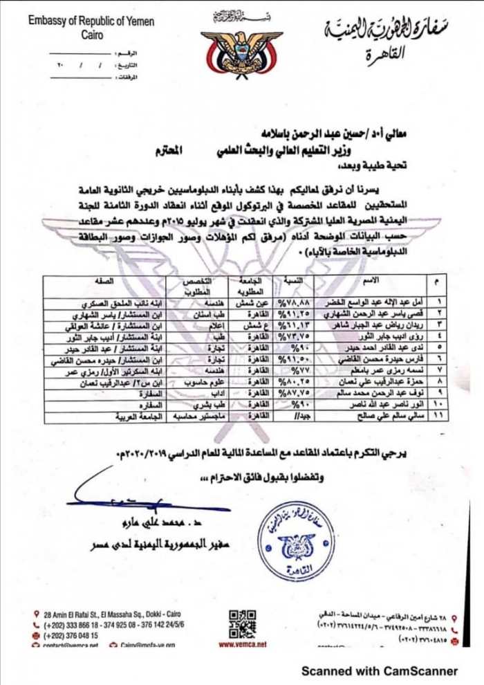 وأشارت الوثيقة الجديدة، إلى أن السفير محمد مارم سفير حكومة الشرعية في مصر قام باستبدال أوائل الثانوية العامة بطلاب آخرين للحصول على منحة التعليم في مصر.