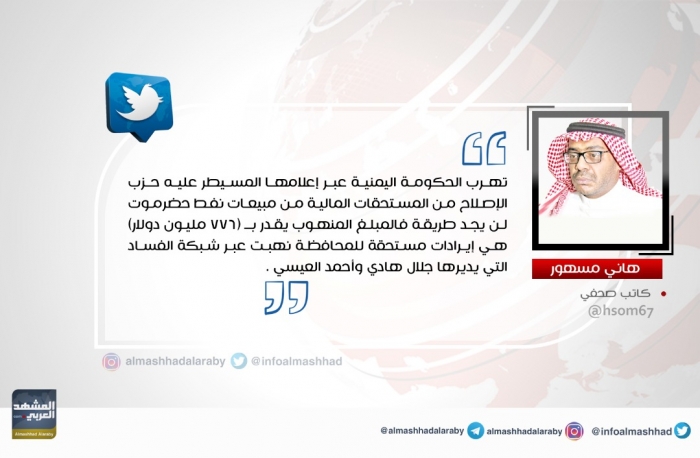 وقال في تغريدة عبر "تويتر" رصدها "المشهد العربي": "تهرب الحكومة اليمنية عبر اعلامها المسيطر عليه حزب الاصلاح من المستحقات المالية من مبيعات نفط حضرموت لن يجد طريقه فالمبلغ المنهوب يقدر بـ (٧٧٦ مليون دولار) هي ايرادات مستحقة للمحافظة نهبت عبر شبكة الفساد التي يديرها جلال هادي وأحمد العيسي *تقرير مفصل سيسلم لوسائل الإعلام لنشره".