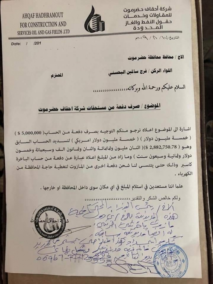 وأكدت هذه الوثائق عدم مصداقية المصدر المسئول بسلطة حضرموت الذي صرح باستلام حصة حضرموت من النفط بإجمالي مبلغ 194مليون دولار بانتظام.