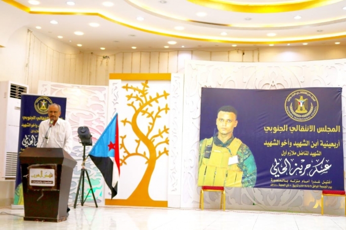 وألقى فضل محمد الجعدي، مساعد الأمين العام لهيئة رئاسة المجلس الانتقالي الجنوبي، كلمة المجلس نقل في مستهلها تعازي الرئيس القائد عيدروس الزُبيدي لأسرة الشهيد .