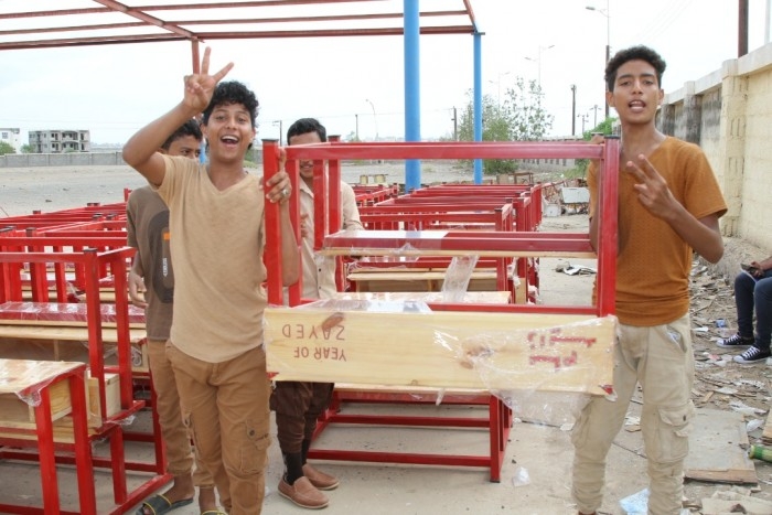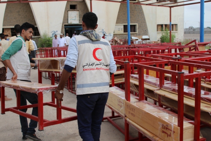 سلمت هيئة الهلال الأحمر الإماراتي، مساعدات تعليمية جديدة لمدارس عدن بينها كراسي لمدرسة القدس في منطقة الشعب بمديرية البريقة.