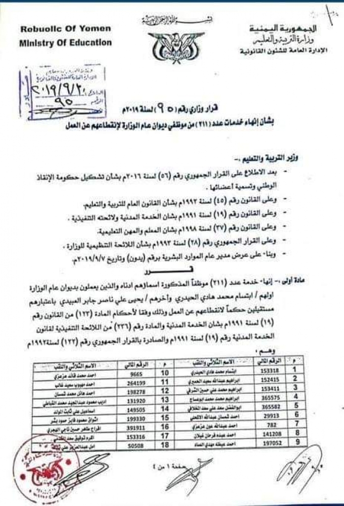 وجاء في نص القرار الصادر عن الشئون القانونية في وزارة التربية التابعة للحوثي، بفصل 211 موظفاً يعملون في ديوان عام الوزارة بصنعاء بدعوى انقطاعهم عن العمل.