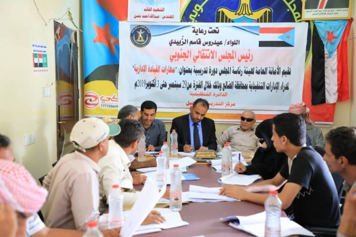 برعاية الرئيس عيدروس الزبيدي، شهدت محافظة الضالع، اليوم الخميس، اختتام فعاليات الدورة التدريبية الخاصة بتنمية مهارات القيادة الإدارية لمدراء الإدارات التنفيذية في القيادة المحلية للمجلس الانتقالي الجنوبي بالمحافظة.