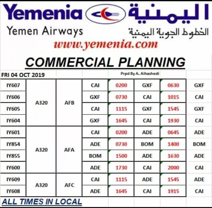 ينشر "المشهد العربي" مواعيد إقلاع رحلات طيران اليمنية غداً الجمعة الموافق 4 أكتوبر 2019.