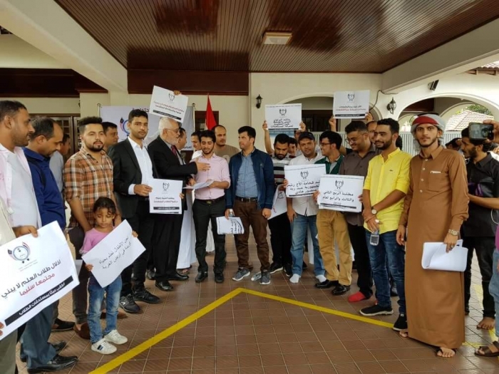 الطلاب المبتعثون بماليزيا يتظاهرون أمام السفارة اليمنية بكوالالمبور