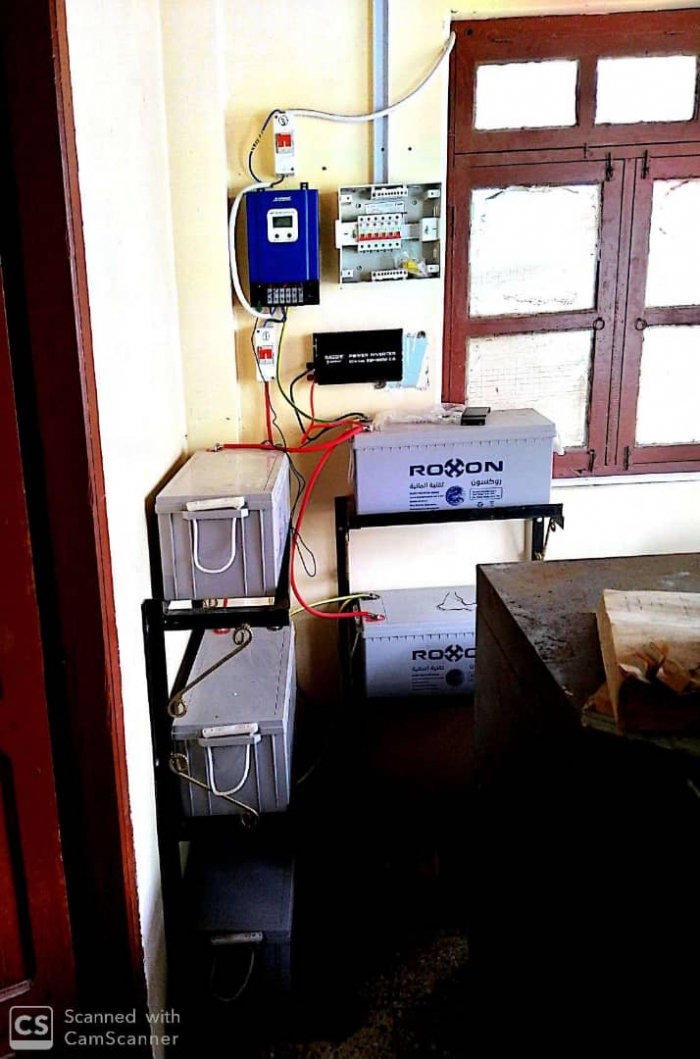 وجرى خلال المشروع تركيب منظومة طاقة شمسية بقوة 12 فولت كشبكة مستقلة بعيدة عن الشبكة العمودية 220 فولت.