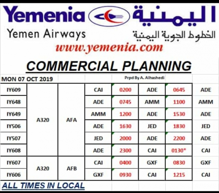 ينشر "المشهد العربي" مواعيد إقلاع رحلات طيران اليمنية غداً الإثنين الموافق 7 أكتوبر 2019.