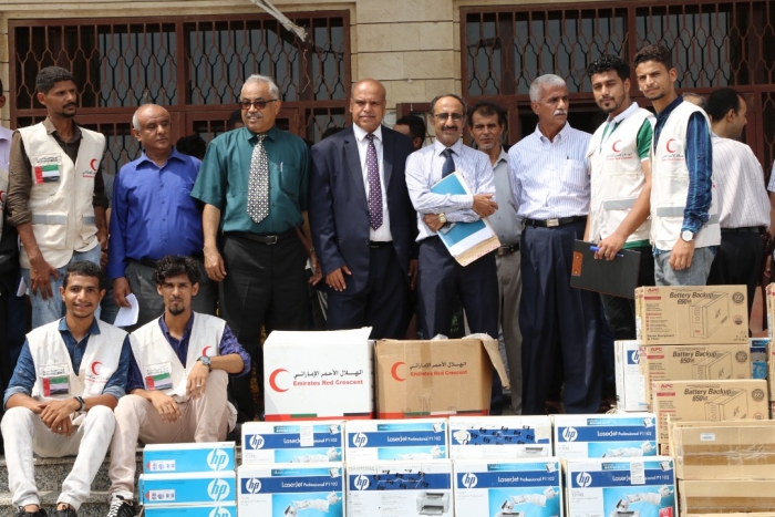 قدمت هيئة الهلال الأحمر الإماراتي اليوم الإثنين، أجهزة كمبيوتر وأدوات إلكترونية لدعم كليات جامعة عدن.