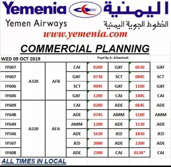 ينشر "المشهد العربي" مواعيد إقلاع رحلات طيران اليمنية غداً الأربعاء الموافق 9 أكتوبر 2019.